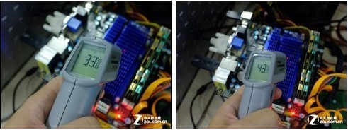 較低的功耗必然帶來(lái)較低的發(fā)熱,事實(shí)果真如此嗎?我們請(qǐng)出了溫度儀來(lái)對(duì)主板的被動(dòng)式散熱片進(jìn)行測(cè)溫,結(jié)果果然沒(méi)有讓人失望:在待機(jī)情況下,散熱片的表面溫度僅為33℃,比人的體溫還要低。而滿載后的43℃也絕對(duì)算不上是高溫。