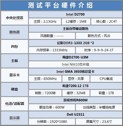 由與梅捷D2700-U3M為整合平臺(tái),因此本次平臺(tái)的搭建也較為簡(jiǎn)單。主板、CPU、顯卡均整合在梅捷D2700-U3M上。4G內(nèi)存,1T硬盤也均為目前較為主流的配置。
