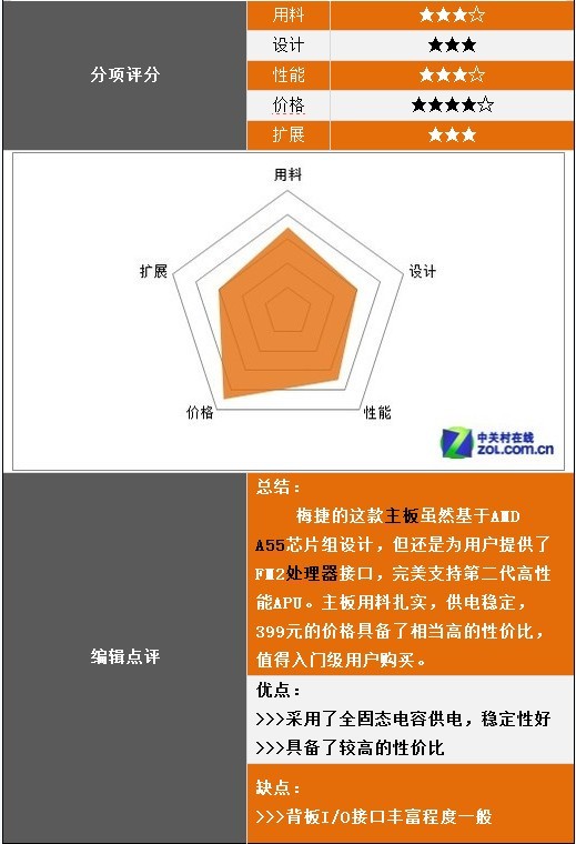 從上面的測試成績中不難發(fā)現(xiàn),梅捷的這款主板搭配第二代APU的性能表現(xiàn)還是不錯(cuò)的,不僅具備了良好的運(yùn)算能力,還能夠在720P分辨率下流暢運(yùn)行全特效的游戲。而值得一提的是,梅捷SY-F2A75X全固版的售價(jià)僅為399元,非常適合入門級用戶選用,完全能夠滿足日常的上網(wǎng)、辦公、影音、游戲等方面的使用需求。