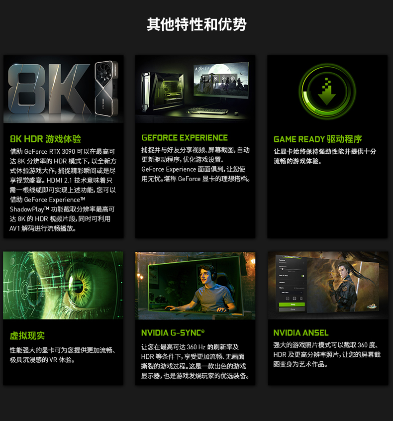 支持Simultaneous Multi-ProjectionVR圖像矯正技術(shù),VRWorks Audio虛擬現(xiàn)實(shí)音頻技術(shù),Ansel截圖功能,PhysX物理加速技術(shù),NVIDIA CUDA,NVIDIA REFLEX,PureVideo HD高清硬件解碼,動(dòng)態(tài)超級(jí)分辨率,MFAA,GeForce 3D Vision,GameWorks™,G-Sync™-Ready,GameStream™-Ready,GeForce ShadowPlay™,GPU Boost™