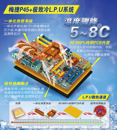 通過一體化熱管系統(tǒng),99.999%純銅PCB內(nèi)層,超導(dǎo)熱焊觸點(diǎn),經(jīng)過三者的完美結(jié)合,讓梅捷主板具備了高散熱效能,主板的溫度比傳統(tǒng)主板低5-8°C。